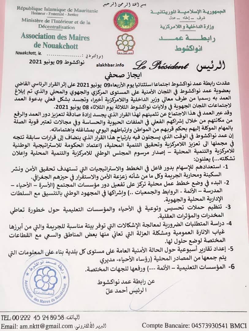 وقالت الرابطة في بيان تلقت الأخبار نسخة منه إنه تم إبلاغ العمد بالقرار رسميا من طرف وزير الداخلية، وتجسد بشكل فعلي بدعوة العمد لاجتماعات اللجان الجهوية في ولايات نواكشوط الثلاث يوم الثلاثاء.