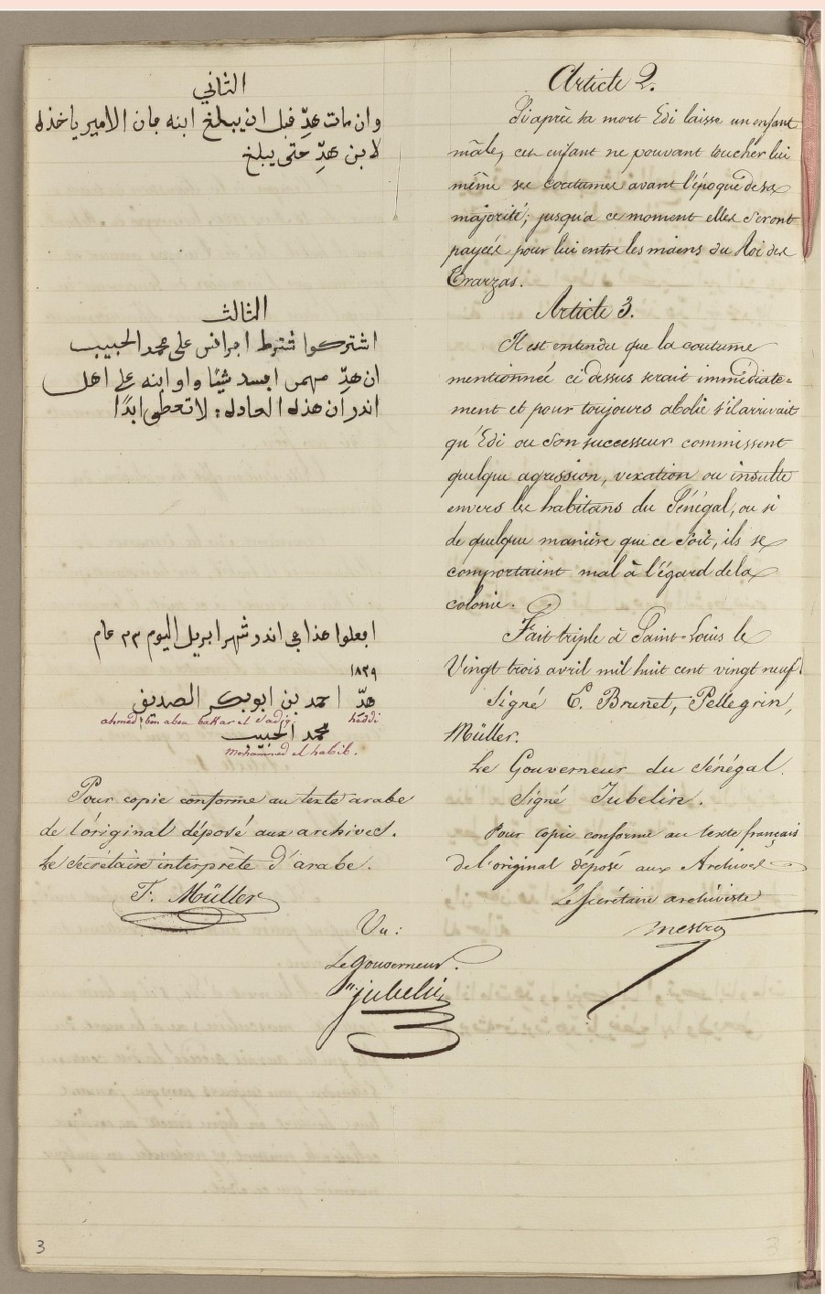 وسأتابع استنطاق هذه الوثائق التي يبدو أنها قليل من كثير وأنها جزء من كل، وأن ما لم يفرج عنه منها أكثر مما ظهر، فما بين أيدينا ليس سوى بعض ما عند الفرنسيين من وثائق كثيرة حول بلادنا، وثائق وقعوها مع أمراء وزعماء موريتانيين، ونرجو أن يتم الكشف عن كل تلك النصوص الباقية، وأن ترى كلها النور، حتى نتمكن من وضع اليد على معلومات ستفيد دون شك المهتم بتاريخ وثقافة هذه البلاد.