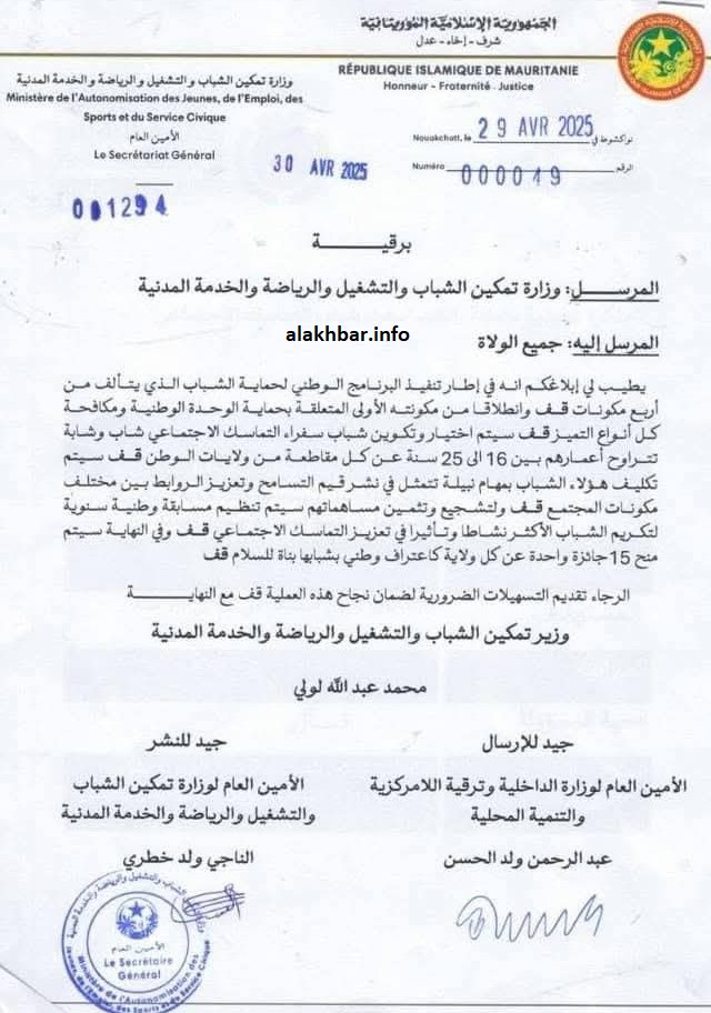 ووقع البرقية الموجهة للولاة الأمين العام لوزارة تمكين الشباب والتشغيل والرياضة والخدمة المدنية الناجي ولد خطري وأكد جاهزيتها، حيث كتب “جيد للنشر”، كما وقعها الأمين العام لوزارة الداخلية وترقية اللا مركزية والتنمية المحلية عبد الرحمن ولد الحسن وأكد جاهزيتها، حيث كتب عليها “جيد للإرسال”
