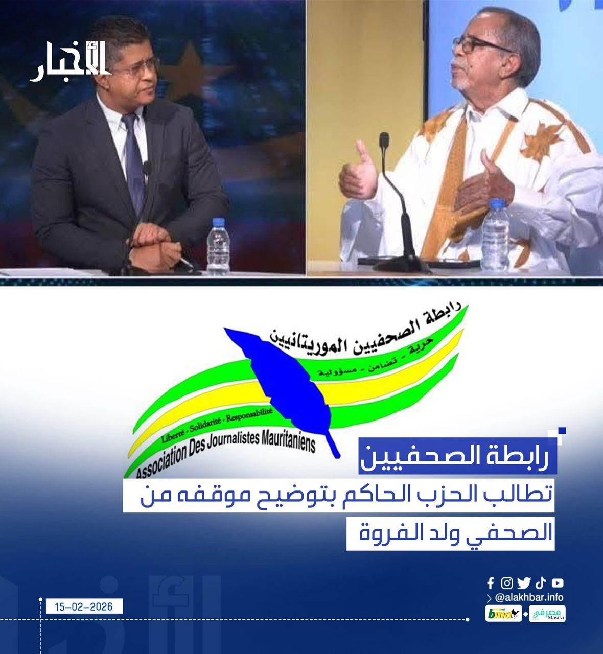 الأخبار (نواكشوط) - طالبت رابطة الصحفيين الموريتانيين حزب الإنصاف الحاكم بالتوضيح الفوري لموقفه من التصرفات "الضاغطة" على الصحفي بقناة "صحراء 24" سليمان ولد الفروة، على خلفية مقابلة أجراها مع نائب رئيسه يحيى ولد أحمد الوقف، في إطار ممارسته المهنية المشروعة.