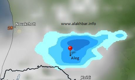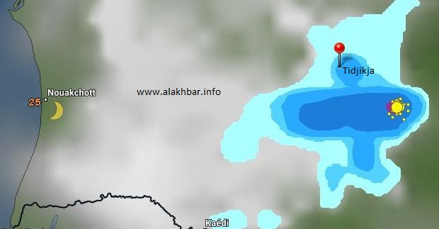 ففى شمال البلاد تتركز الآن السحب الممطرة الخفيفة إلى التوسطة على وسط تيرس زمور، من بير أم اغرين وحتى شمال آدرار، فيما تتواجد عدة سحب أخرى أكثر كثافة على مناطق عديدة من شرق آدرار، 70 كلم شرق وادان وشنقيط، يتوقع أن تزداد اتساعا فى الساعات المقبلة بإذن الله تعالى.