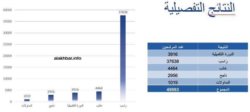وبلغت نسبة النجاح في الباكلوريا 8% كانت نجاح 2% منهم عن طريق المداولات، كما تجاوز عدد الغائبين عن الامتحان الأول عدد النجاحين فيه، حيث بلغ عدد الغائبين 4464 أي نسبة 9%، في حين لم يتجاوز عجج الناجحين 2956 أي نسبة الناجحين 8%، وذلك من مجموع المترشحين للامتحان البالغ عددهم 49993.