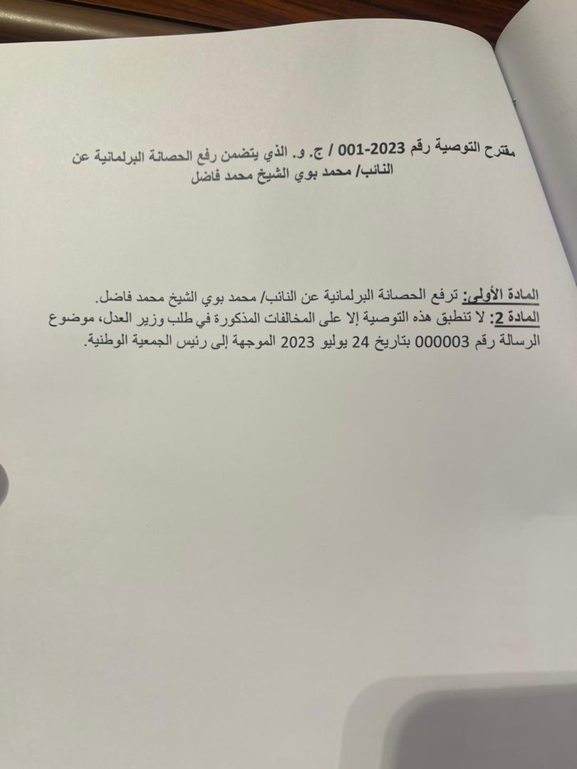 مقترح التوصية رقم 2023-001 / ج . و . ا لذي يتضمن رفع الحصانة البرلمانية عن النائب محمد بوي الشيخ محمد فاضل