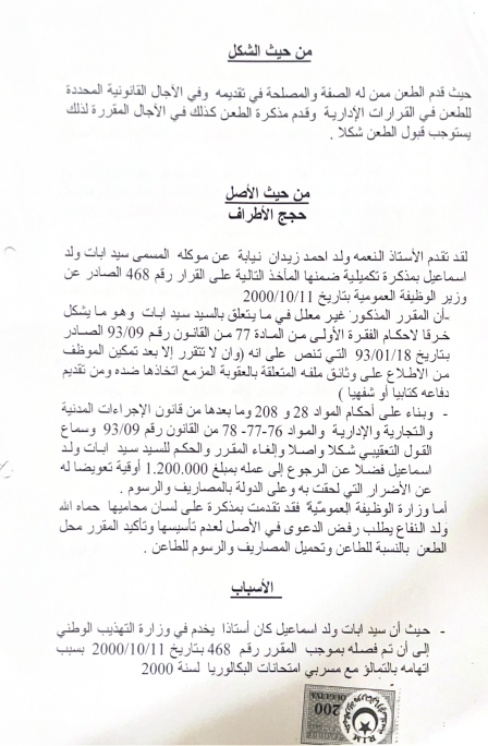 وتقدم ولد إسماعيل عبر محاميه بطعن في مقرر صادر عن وزير الوظيفة العمومية يفصله مع الوظيفة العمومية عقب تسريب باكلوريا 2000.