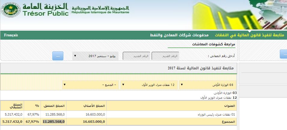 الأخبار (نواكشوط) – كشف موقع الخزينة العامة الموريتانية أن منزل الوزير الأول يحي ولد حدمين أنفق خلال الأشهر الثمانية الأولى من 2017 مبلغ 11.285.568 أوقية، وهو ما يمثل نسبة 67,97% من الميزانية المخصصة له والبالغة 16.603.000 أوقية.