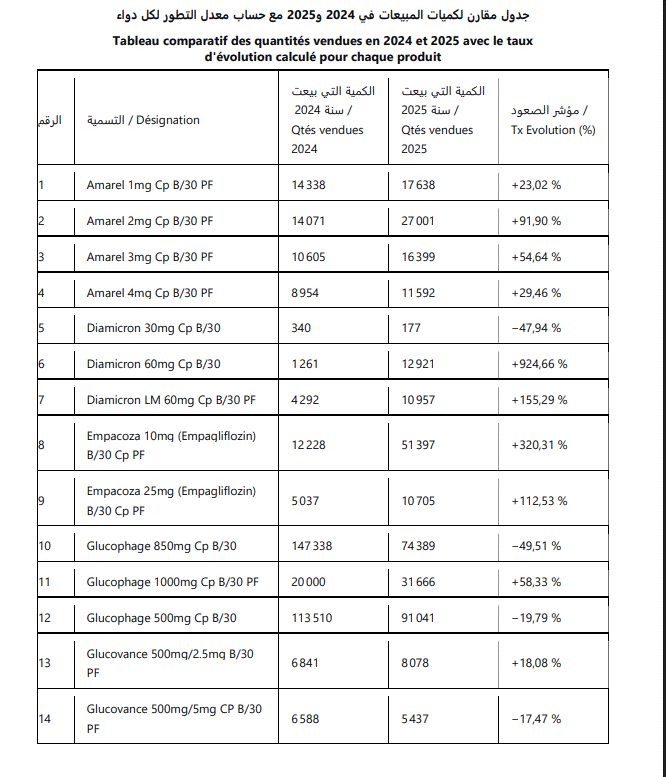 وأشارت الشركة إلى أن البيانات الرسمية لمبيعات وتوزيع أدوية الأمراض المزمنة خلال سنتي 2024 و2025 تُظهر تحسنا ملحوظا في تموين غالبية هذه الأدوية (انظر الملف المرفق)، خاصة أدوية السكري والأنسولين، حيث سُجلت زيادات معتبرة في كميات عدد من الأصناف الأساسية، بما في ذلك الأدوية الفموية الحديثة والأنسولين بمختلف أشكاله.