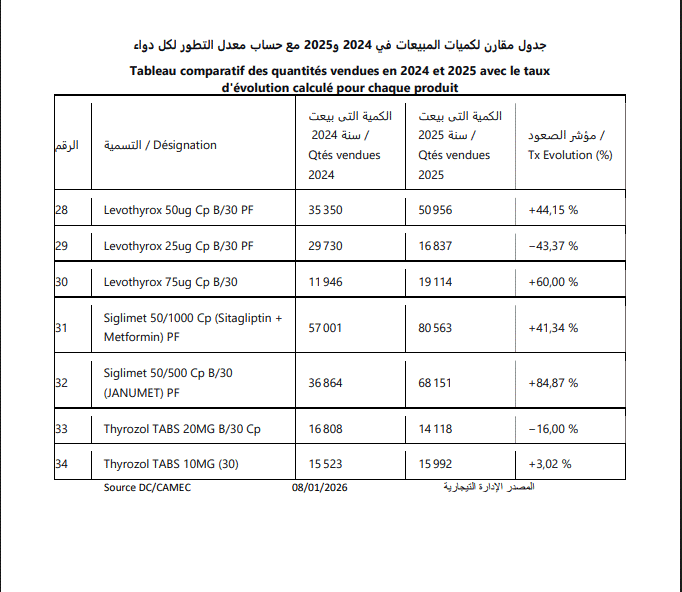 ووفق الشركة تُبين المعطيات تحسن توفر عدة صيغ من Levothyrox، في حين أن التراجع المسجل في بعض الأصناف المحدودة يرتبط أساسا بتغير أنماط الوصفات الطبية، أو بالتحول نحو بدائل علاجية أحدث، ولا يعكس انقطاعا عاما أو هيكليا في تموين أدوية الأمراض المزمنة.