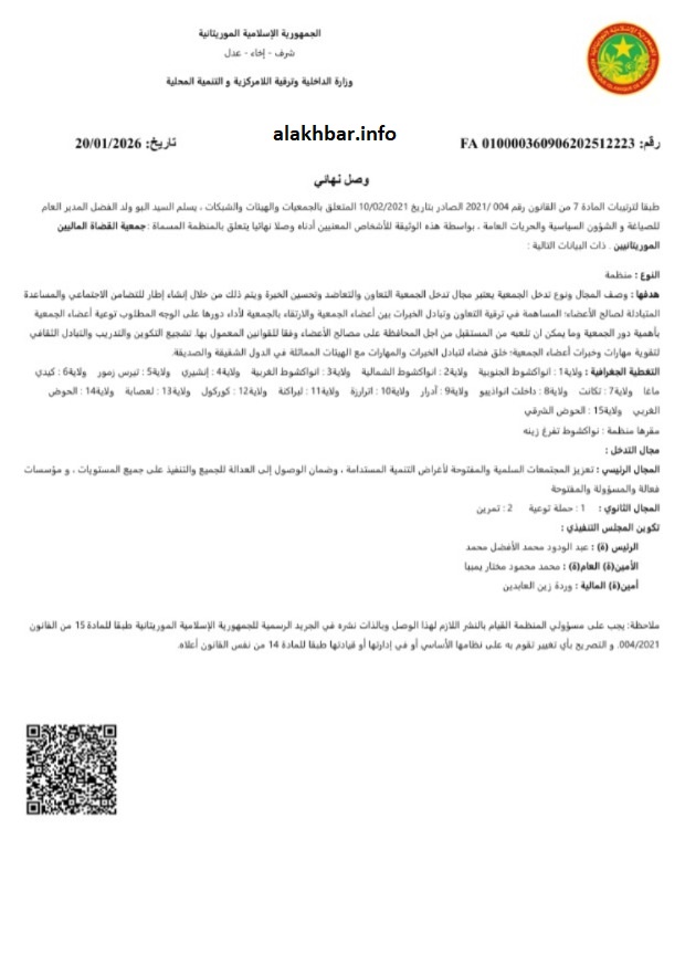 الأخبار (نواكشوط) – أعلن المكتب التنفيذي لجمعية القضاة الماليين الموريتانيين تسلم الترخيص النهائي للجمعية الصادر عن وزارة الداخلية، لتدخل الجمعية بذلك حيز العمل الرسمي في إطار قانوني منظم.