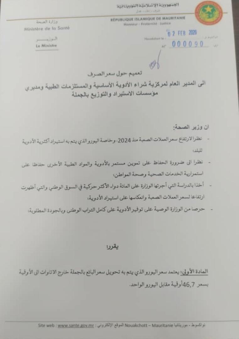 ووفقاً لتعميم صادر عن وزير الصحة بتاريخ 02 فبراير 2026، موجه إلى المدير العام للمركزية لشراء الأدوية الأساسية والمستلزمات الطبية (كاميك) ومديري مؤسسات الاستيراد والتوزيع بالجملة، فقد تقرر اعتماد سعر صرف بقيمة 467 أوقية قديمة مقابل اليورو الواحد لتحويل سعر البيع بالجملة (خارج الإتاوات).