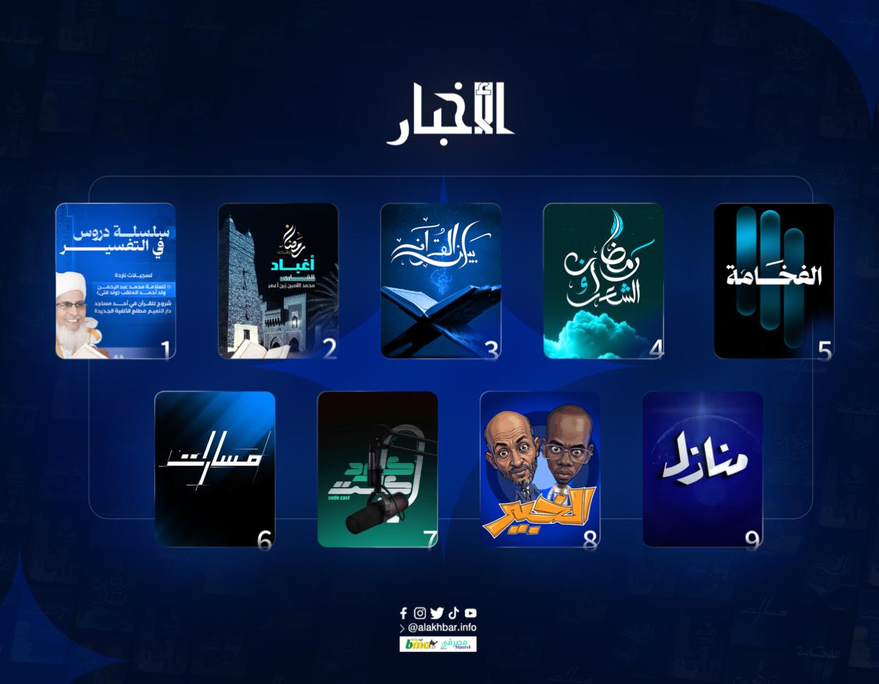 الأخبار (نواكشوط) - أعلنت وكالة الأخبار المستقلة اليوم الأربعاء باقة برامجية جديدة متنوعة خاصة بشهر رمضان المبارك، تتصدرها برامج قرآنية، تلاوة، وتفسيرا، وتوقفا مع إعجاز القرآن الكريم.