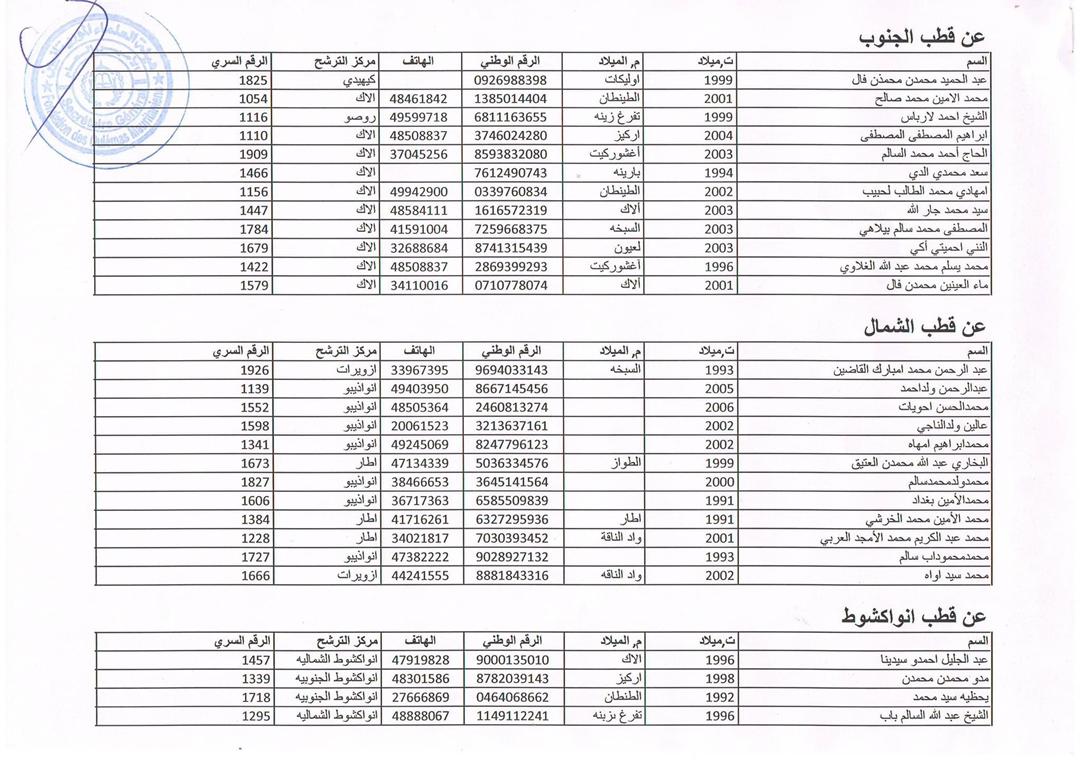 وفاز بالمرتبة الأولى عن قطب الشرق، باب عبد الله باب، فيما حل عبد الحميد محمدن محمذن فال، في المرتبة الأولى عن قطب الجنوب، وجاء عبد الرحمن محمد امبارك القاضين، في المرتبة الأولى عن قطب الشمال، وكان الرتبة الأولى في قطب نواكشوط لعبد الجليل أحمدو سيدينا.