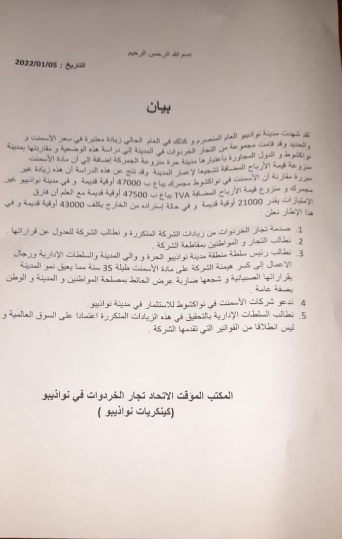 الأخبار (نواذييو ) - اتهمت مجموعة من تجار الخردوات في العاصمة الاقتصادية، شركة إسمنت الشمال ب"إعاقة نمو المدينة" من خلال "قراراتها الضبابية وجشعها والضرب عرض الحائط بمصلحة المواطنين" حسب قولهم.