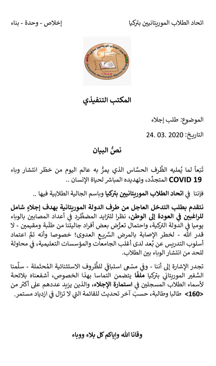 الأخبار (نواكشوط) طالب اتحاد الطلاب الموريتانيين في تركيا، بالتدخل بهدف إجلاء شامل للطلاب الموريتانيين الراغبين في العودة إلى الوطن.