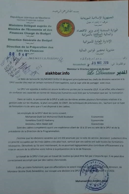 الأخبار (نواكشوط) – وقع موظفون بوزارة رسالة وجهوها لكبار المسؤولين في الوزارة احتجاجا على ما وصفوها بتعيينات غير مستحقة، ولم تراع الكفاءة في مصالح وأقسام بإدارة البرمجة.