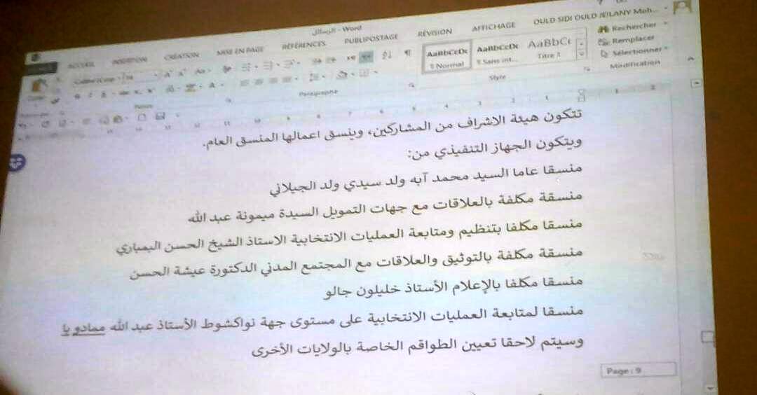 وتتكون الهيئة من لجنة إشراف ولجنة تنفيذية وطواقم ميدانية من ضمنهم: د. آبه ولد سيدي ولد الجيلاني منسقا عاما، ميمونة عبد الله منسقة مكلفة بالعلاقات مع جهات التمويل، الشيخ الحسن البمباري منسقا مكلفا بتنظيم ومتابعة العمليات الانتخابية، د. عيشة الحسن منسقة مكلفة بالتوثيق والعلاقات مع المجتمع المدني، خاليلو جالو منسقا مكلفا بالإعلام، عبد الله ممادوبا منسق متابعة العمليات الانتخابية على مستوى جهة نواكشوط.