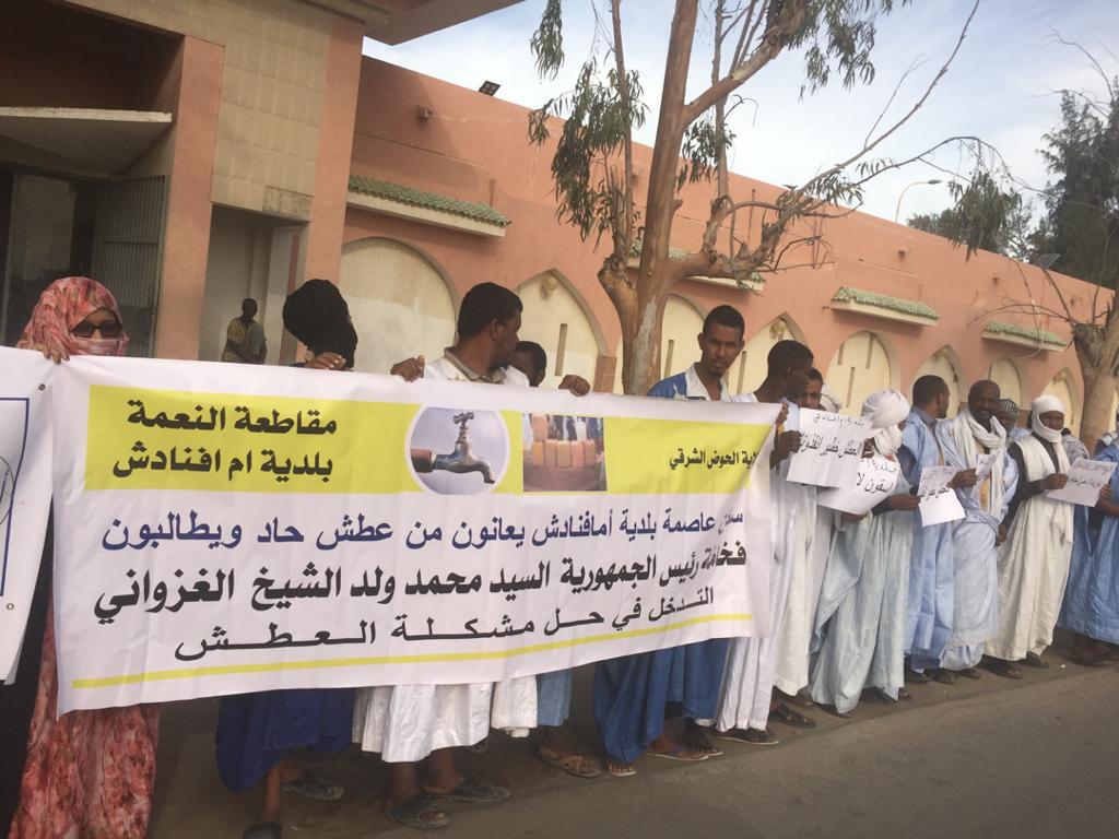 الأخبار (نواكشوط) – تظاهر عدد من سكان بلدية أم آفنادش بولاية الحوض الشرقي صباح اليوم الخميس أمام القصر الرئاسي للمطالبة بتوفير مياه الشرب للساكنة، مؤكدين أن وضعية السكان أضحت صعبة بعد تعطل المولد الكهربائي، ونضوب مياه الآبار التقليدية.