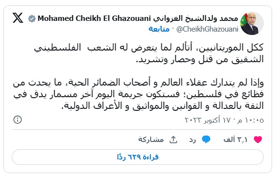وعلى خطى سلفه حافظ الرئيس محمد ولد الشيخ الغزواني على قطع العلاقات، وقاد حزبه الحاكم حملة للدعم السياسي والتبرعات المالية، وشارك في وقفات أمام الأمم المتحدة وسفارات غربية في نواكشوط، كما شاركت لأول مرة زوجة الرئيس الحالي في مسيرة داعمة للمقاومة، وعُيّن ممثل لحركة المقاومة الإسلامية (حماس) في موريتانيا.