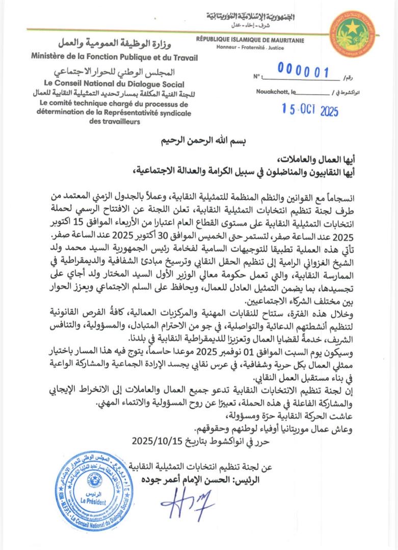 وأضافت اللجنة أن العملية تأتي تطبيقا لتوجيهات الرئيس محمد ولد الغزواني الرامية "إلى تنظيم الحقل النقابي وترسيخ مبادئ الشفافية والديمقراطية في الممارسة النقابية".