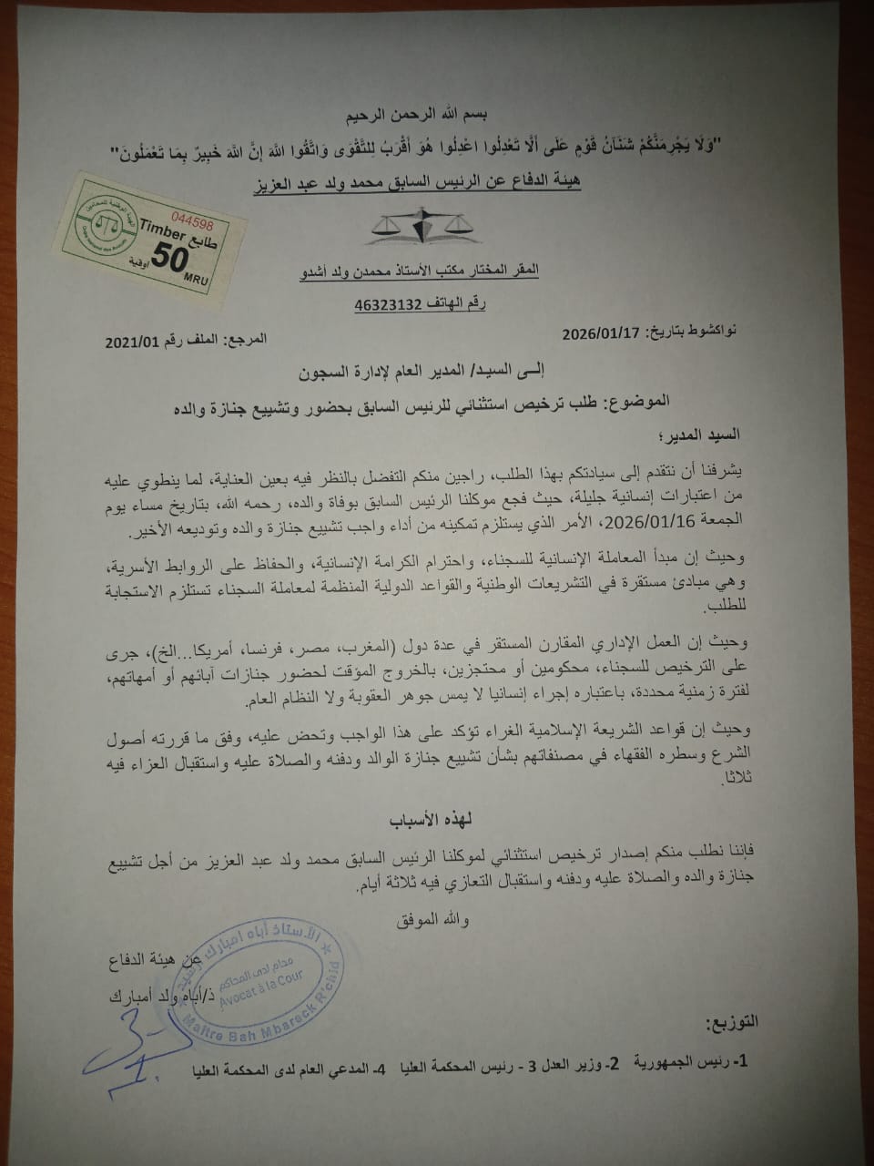 وكانت هيئة الدفاع عن الرئيس السابق طالبت بإصدار ترخيص استثنائي لولد عبد العزيز من أجل حضور صلاة الجنازة على والده واستقبال التعازي لمدة ثلاثة أيام.