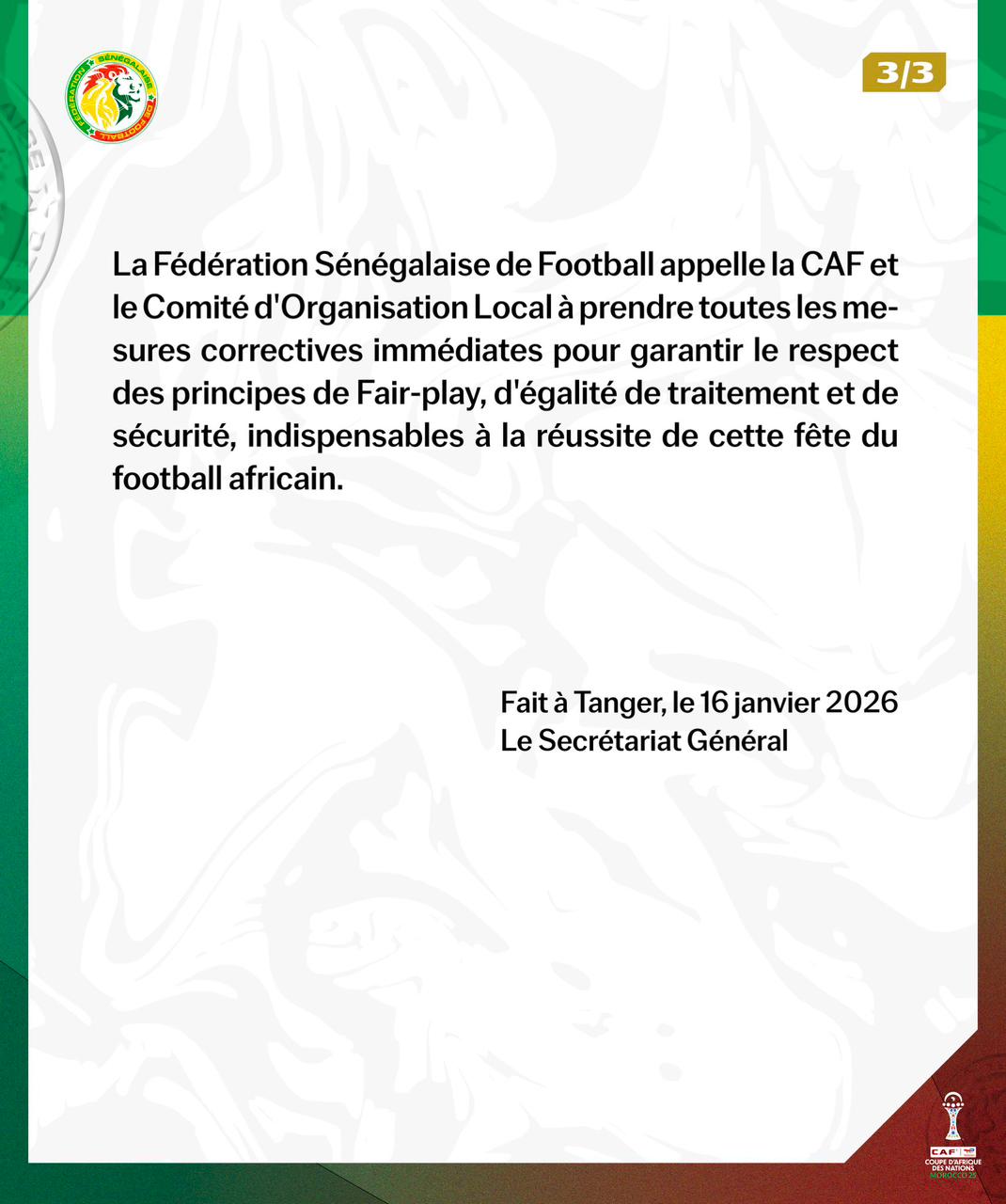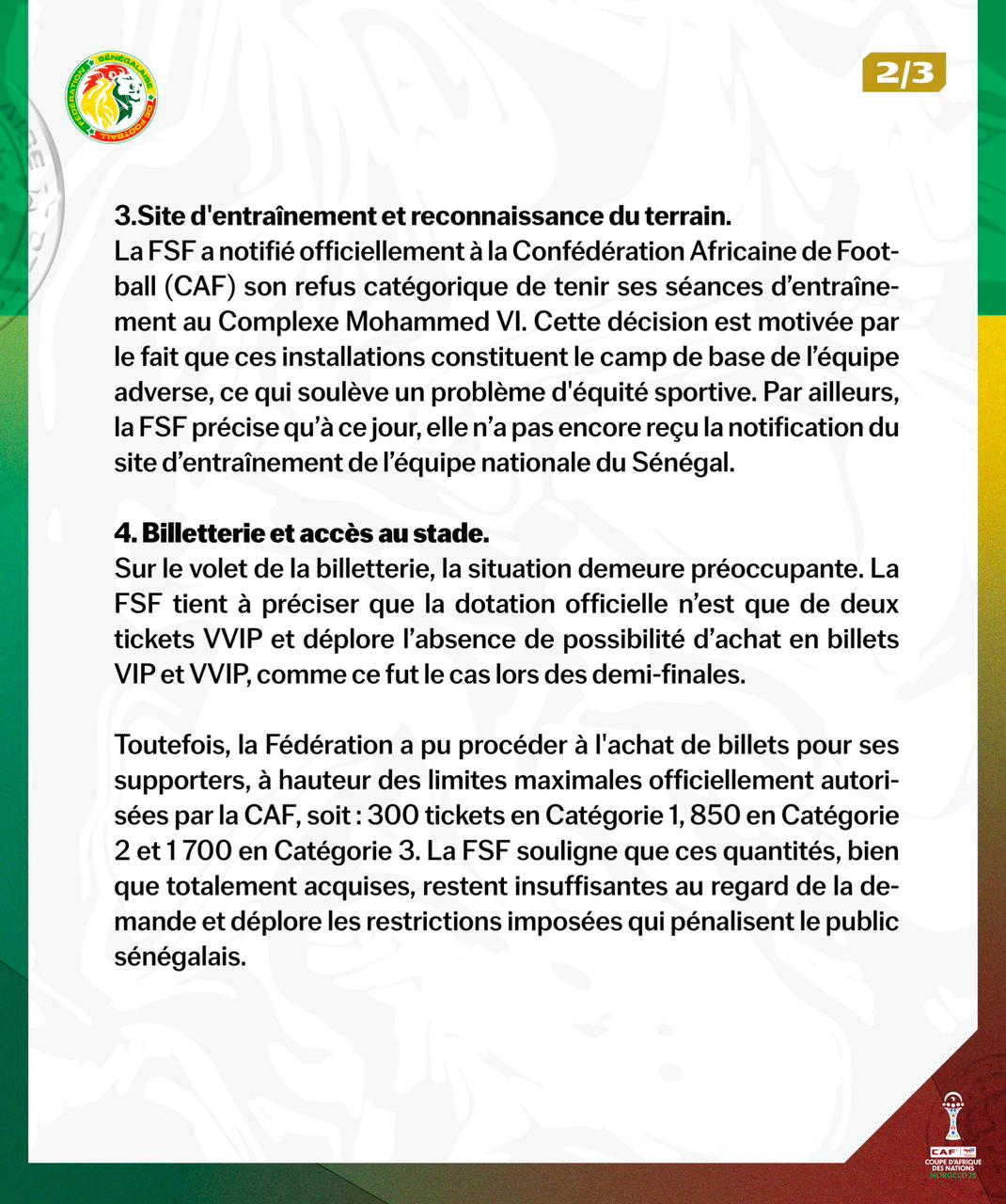 وأبرز أنه أبلغ رسميا الاتحاد الإفريقي لكرة القدم "رفضه القاطع إجراء حصصه التدريبية في مركب محمد السادس. ويعود هذا القرار إلى كون هذه المنشأة تمثل معسكرا للفريق المنافس، وهو ما يثير إشكالا يتعلق بتكافؤ الفرص الرياضية. كما يوضح الاتحاد أنه إلى حدود هذا اليوم (الجمعة) لم يتلقَّ بعد إشعارا بخصوص موقع تدريبات المنتخب الوطني السنغالي".