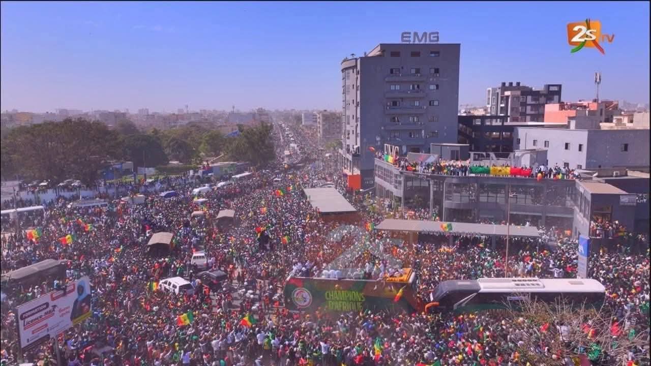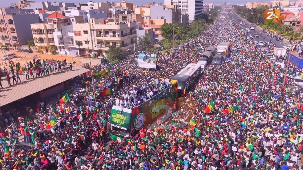 واحتشد ٱلاف السنغاليين في مختلف الشوارع الرئيسية بالعاصمة داكار، احتفاء بساديو ماني ورفاقه، رافعين أعلام بلادهم، في أجواء حماسية.