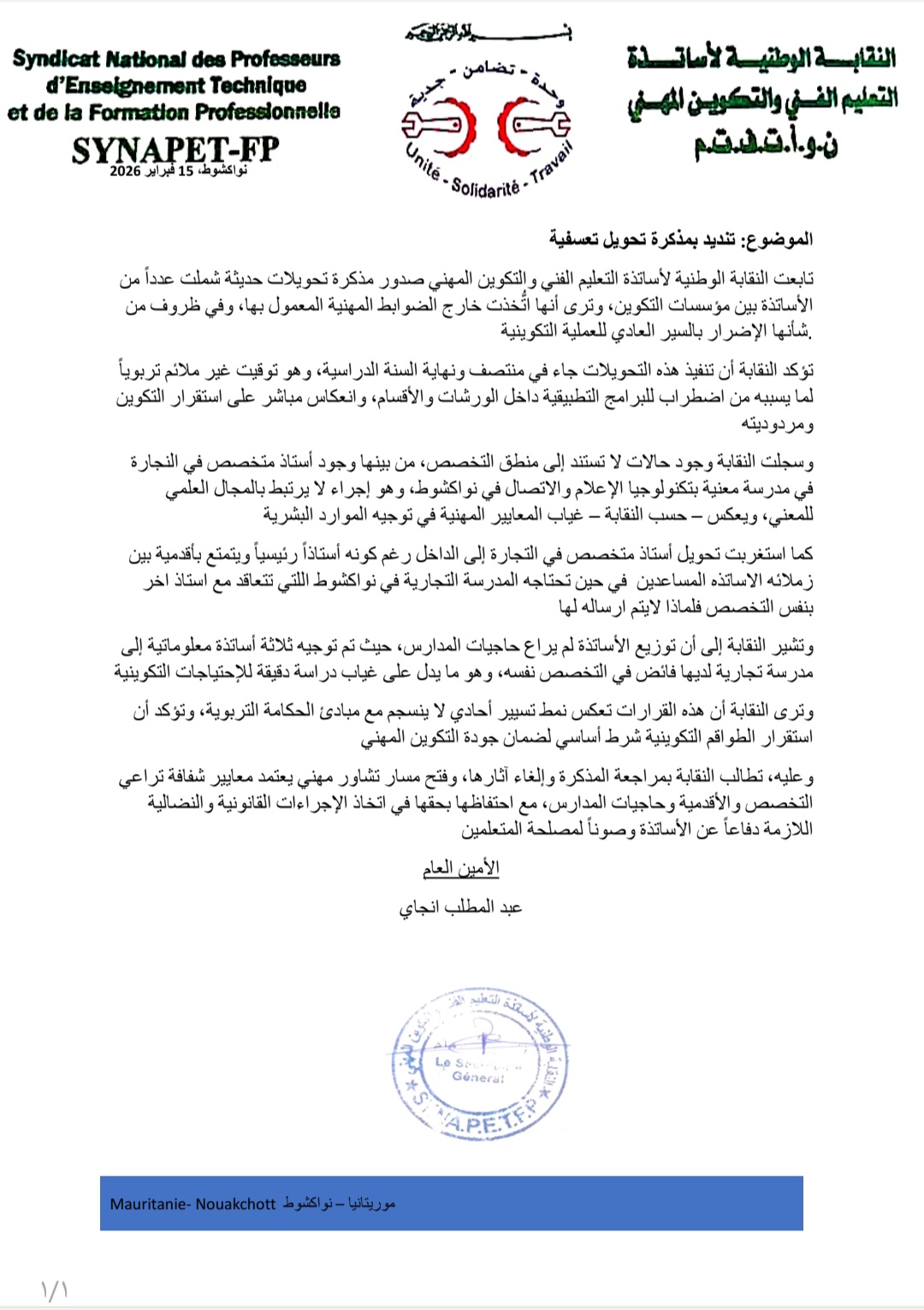 الأخبار (نواكشوط) - طالبت النقابة الوطنية لأساتذة التعليم الفني والتكوين المهني بمراجعة مذكرة التحويل الأخيرة وإلغاء آثارها، وكذا فتح مسار تشاور مهني يعتمد معايير تراعي التخصص والأقدمية وحاجيات المدارس.