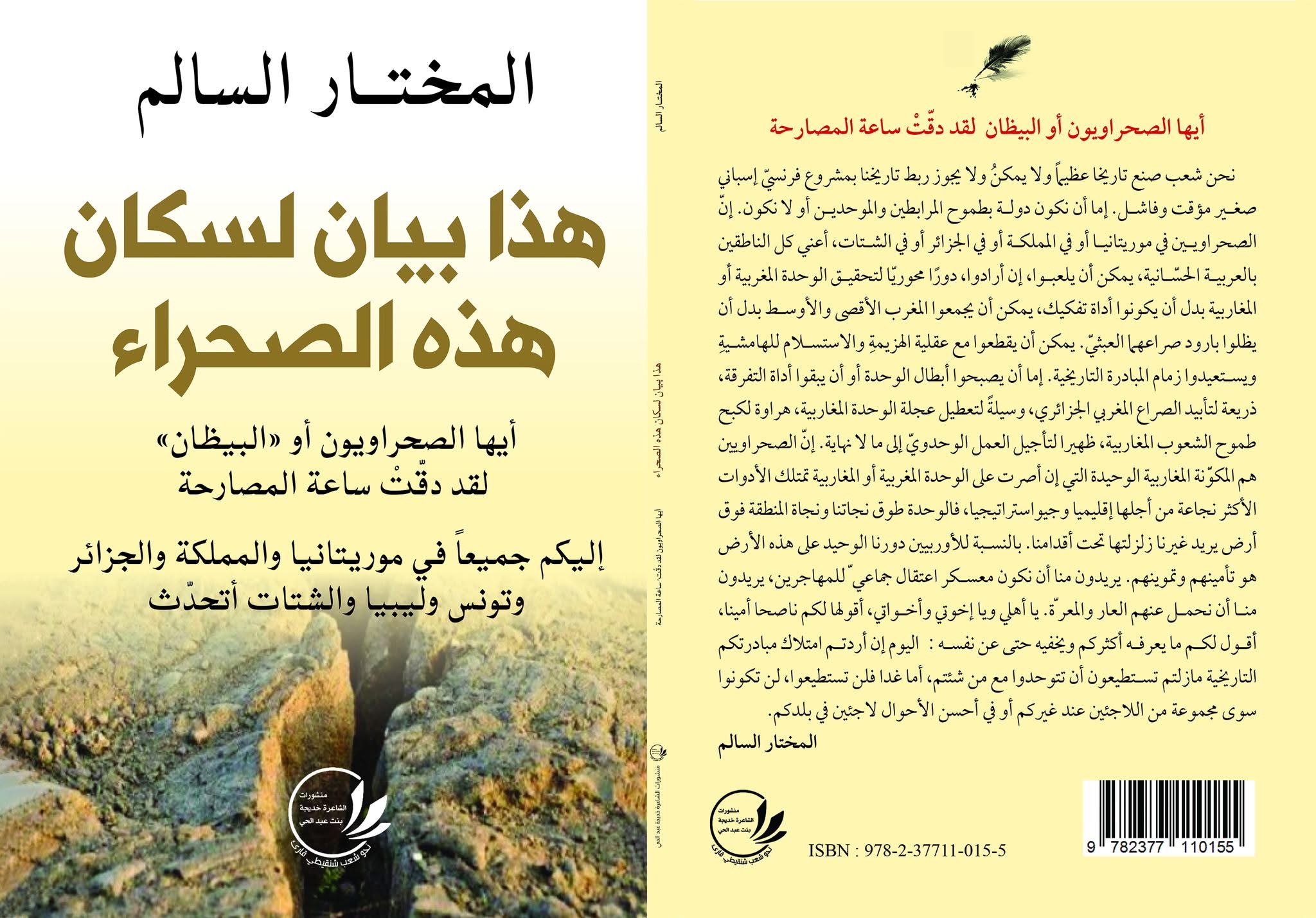 كما حمل الكتاب على غلافه عناوين فرعية، هي: “أيها الصحراويون أو “البيظان” لقد دقّتْ ساعة المصارحة” و”إليكم جميعاً في موريتانيا والمملكة والجزائر وتونس وليبيا والشتات أتحدّث”.