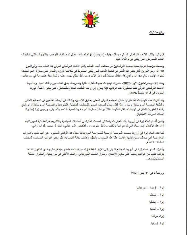 الأخبار (نواكشوط) نددت أقسام حركة إيرا في أوروبا بـ”صمت” المؤسسة الرسمية للمعارضة الديمقراطية تجاه التهديدات التي تعرض لها النائب بيرام الداه اعبيد، فيما أشادت بالأحزاب المعارضة التي قالت إنها تحمّلت مسؤولياتها وأدانت علنًا هذه “التهديدات بالقتل وكشفت حالة اللامبالاة، بل وحتى التواطؤ الصامت، لمختلف السلطات القائمة”.