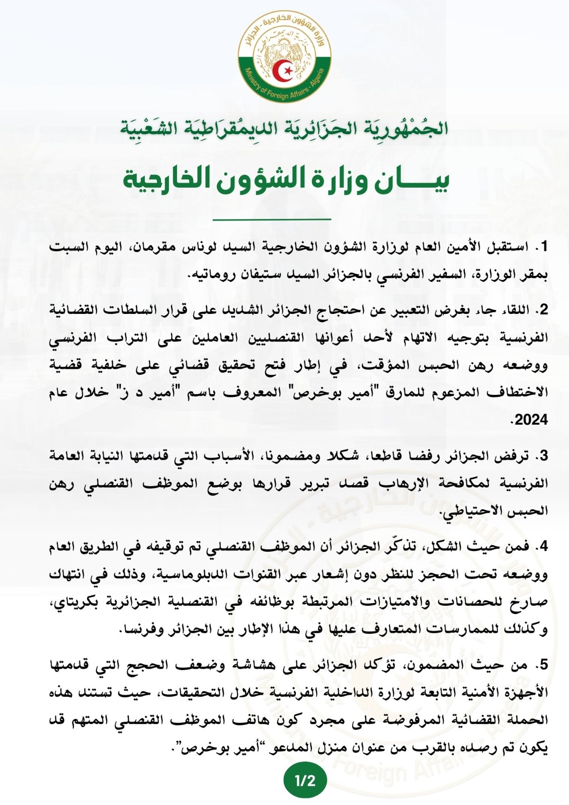 وأفاد البيان بأن الأمين العام لوزارة الشؤون الخارجية لوناس مقرمان، استقبل السفير الفرنسي لدى الجزائر ستيفان روماتيه “بغرض التعبير عن احتجاج الجزائر الشديد على قرار السلطات القضائية الفرنسية بتوجيه الاتهام لأحد أعوانها القنصليين العاملين على التراب الفرنسي ووضعه رهن الحبس المؤقت”.