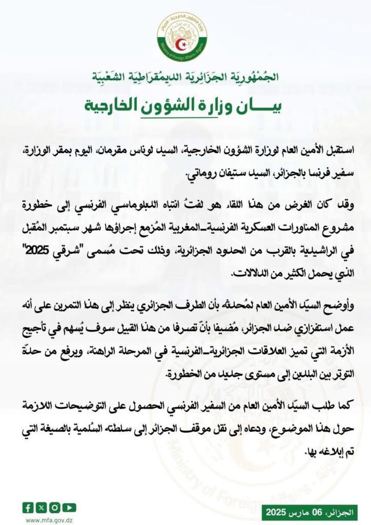 ونبه الأمين العام للخارجية الجزائرية سفير فرنسا في الجزائر إلى أن هذه المناورات تحمل اسم “شرقي 2025″، والذي وصفه بأنه “يحمل الكثير من الدلالات”.