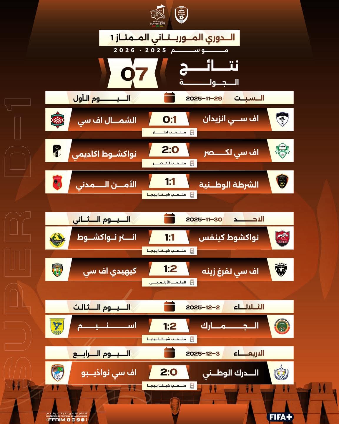 الأخبار(نواكشوط)-شهدت مباريات الجولة السابعة من الدوري الوطني الممتاز لكرة القدم، نتائج متنوعة، بينما حافظ نادي الجمارك على انفراده بصدارة الترتيب.
