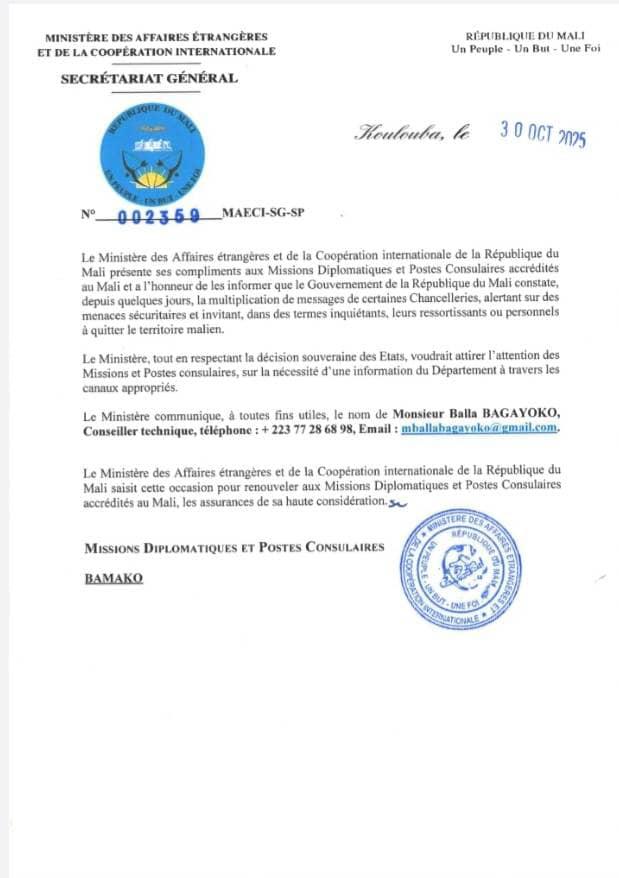 الأخبار (باماكو) – أعلنت وزارة الخارجية المالية اليوم الخميس، أن حكومة البلاد “لاحظت منذ بضعة أيام تزايد الرسائل الصادرة عن بعض السفارات، تحذر من تهديدات أمنية مزعومة، وتدعو بعبارات مثيرة للقلق، رعاياها إلى مغادرة الأراضي المالية”.