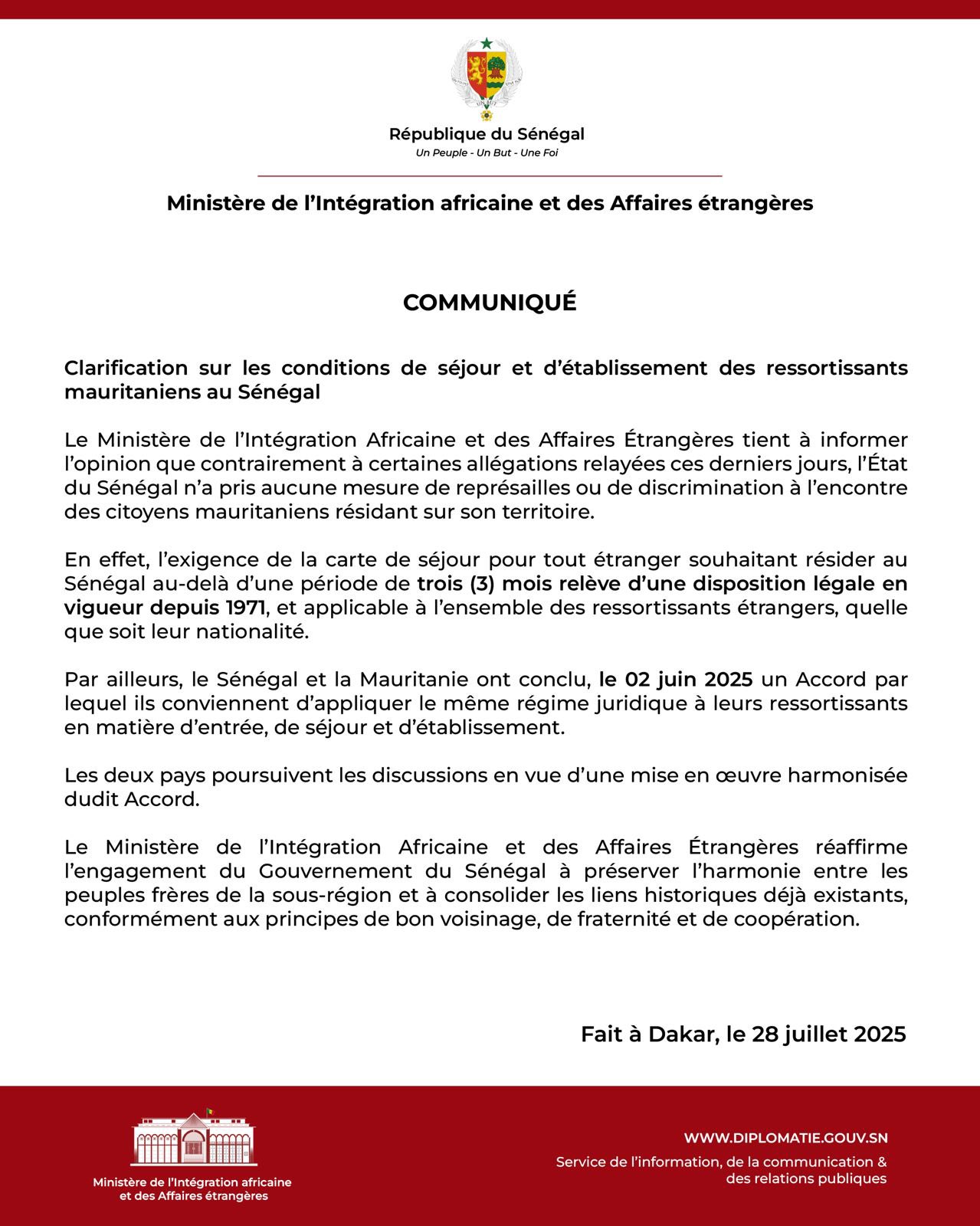 وأشارت الوزارة إلى توقيع “السنغال وموريتانيا في 2 يونيو 2025 اتفاقا، اتَّفق بموجبه البلدان على تطبيق ذات النظام القانوني على مواطنيهما فيما يتعلق بالدخول والإقامة والاستقرار”، مشيرة إلى أن نقاشات الطرفين مستمرة “بهدف تنفيذ هذا الاتفاق بشكل منسق”.