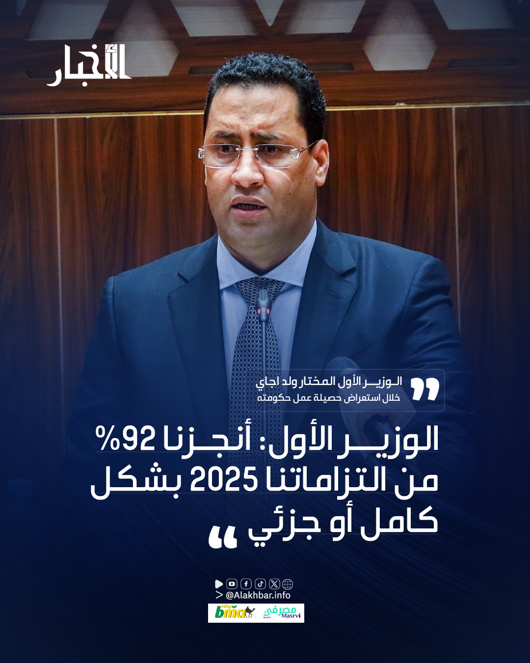 الأخبار (نواكشوط) – قال الوزير الأول المختار ولد اجاي إن حكومته تمكنت من إنجاز التزاماتها خلال 2025 بنسبة 92%، نسبة 74% منها بشكل كامل و18 بشكل جزئي.