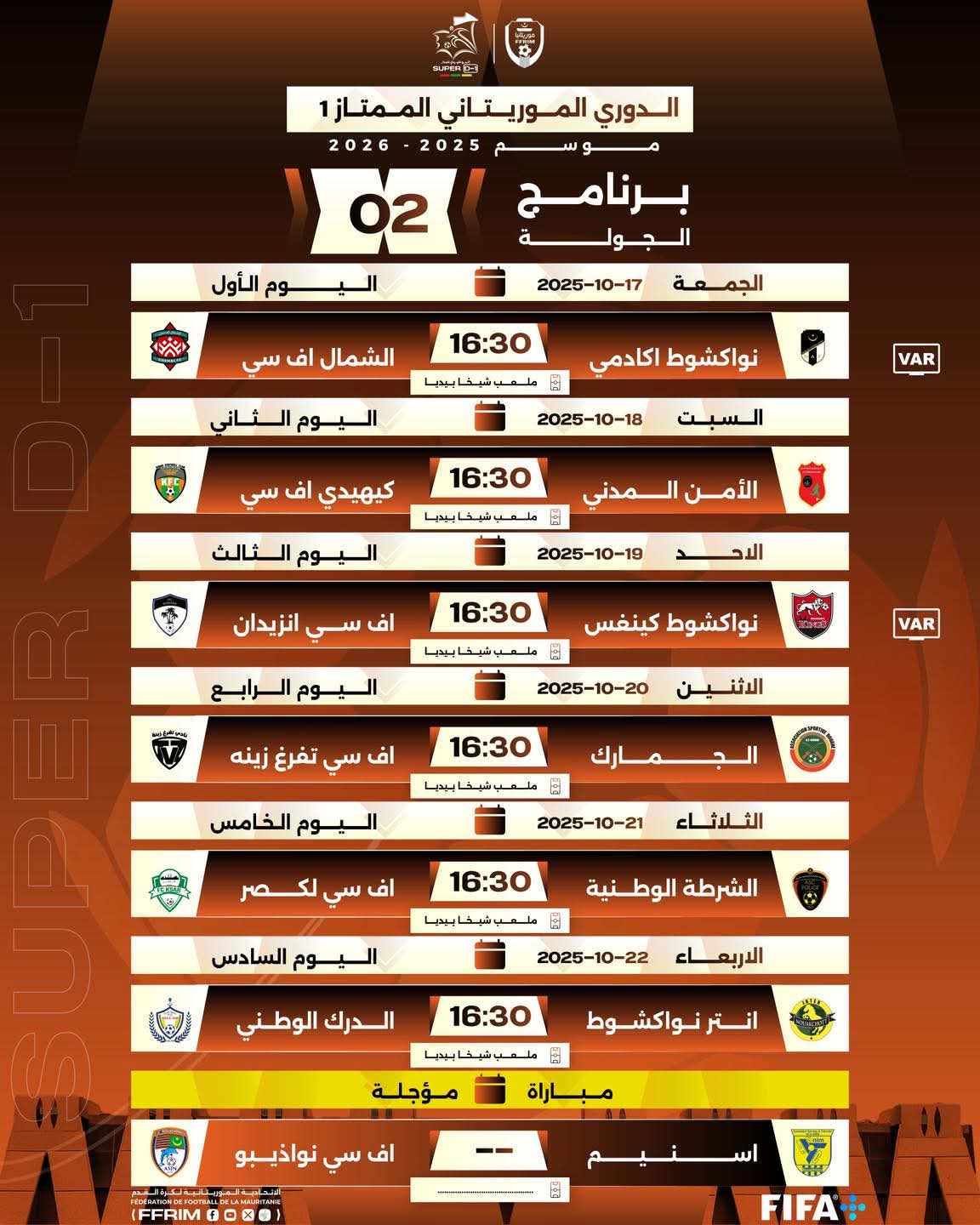 الأخبار (نواكشوط) – أعلن الاتحاد الموريتاني ة لكرة القدم عن برنامج الجولة الثانية من الدوري الموريتاني الممتاز (سوبر 1) لموسم 2026-2025، وذلك بعد أن توج فريق الجمارك بصدارة الجولة الأولى.