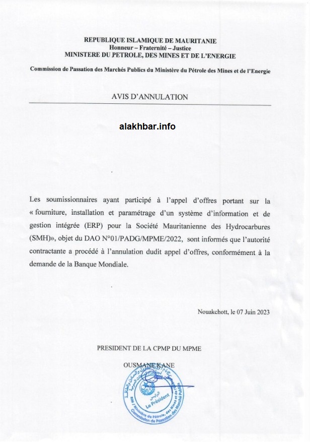 وأصدرت لجنة صفقات قطاع البترول والطاقة والمعادن أول أمس الأربعاء قرارا ألغت بموجبه المناقصة، وذلك بعد توصلها بتقرير من سلطة تنظيم الصفقات ألغت بموجبها منحها لتجمع “SKATYS-ADIAS” للمرة الثانية، حيث ترجح خيار الإلغاء بصوت رئيس السلطة أحمد سالم ولد التباخ، وذلك بعد انقسام لجنة النزاعات بشأن القرار النهائي من الصفقة بين تثبيتها وإلغائها.
