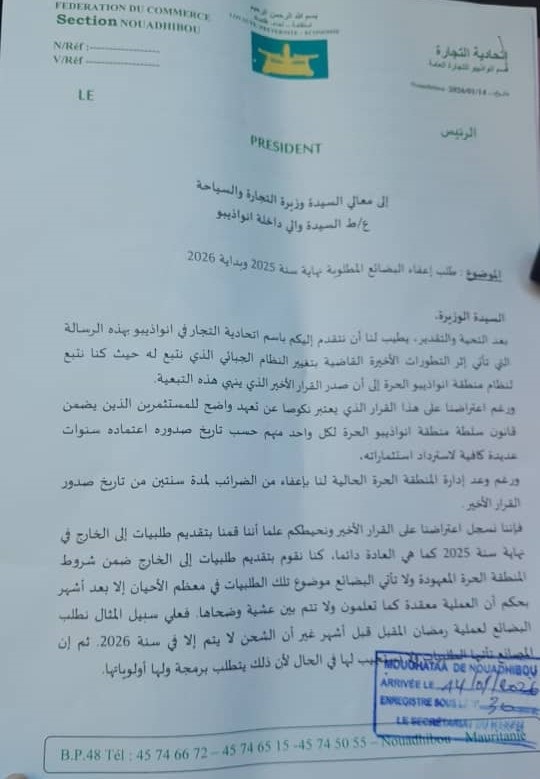 ووصفت اتحادية التجار بداخلت نواذيبو في رسالة بعثت بها إلى وزيرة التجارة، وحصلت وكالة الأخبار المستقلة على نسخة منها القرار بكونه “نكوصا عن تعهد واضح للمستثمرين الذين يضمن قانون المنطقة الحرة لكل واحد منهم حسب تاريخ صدوره اعتماده سنوات كافية لاسترداد استثماراته”.