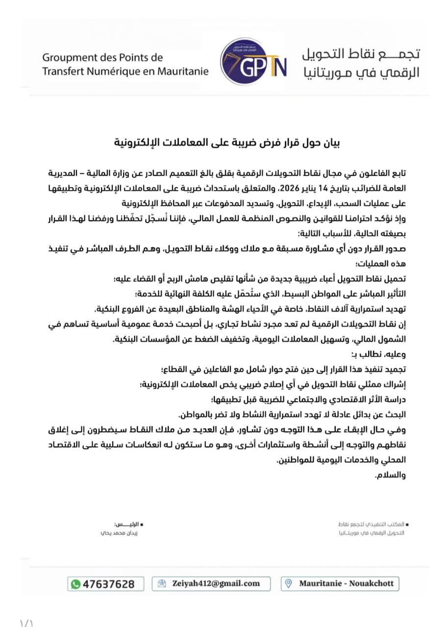 الأخبار(نواكشوط) – طالب تجمع نقاط التحويل الرقمي في موريتانيا بتجميد قرار الضريبة الإلكترونية الصادر عن المديرية العامة للضرائب قبل أيام إلى حين فتح حوار شامل مع الفاعلين في القطاع، كما أبدى تحفظه عليه بصيغته الحالية.