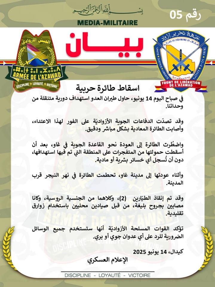 الأخبار (باماكو) – أعلنت جبهة تحرير أزواد اليوم السبت أن الدفاعات الجوية الأزوادية “أصابت طائرة معادية (مالية) بشكل مباشر ودقيق”، ما اضطرها إلى “العودة نحو القاعدة الجوية في غاو” بالشمال المالي.
