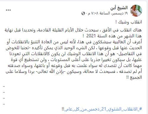وأشار ولد أبن إلى أنه تحدث في التدوينة عن “انقلاب وشيك” سيحدث خلال أيام قليلة قبل نهاية هذا الشهر من هذه السنة، لافتا إلى أنه “كان من الواضح أن المقصود هو “الانقلاب الشتوي” السنوي المعروف الذي حدث الثلثاء، والذي يحدث بداية فصل الشتاء من كل عام وفى توقيت ثابت دائما وهو 21 دجمبر”.