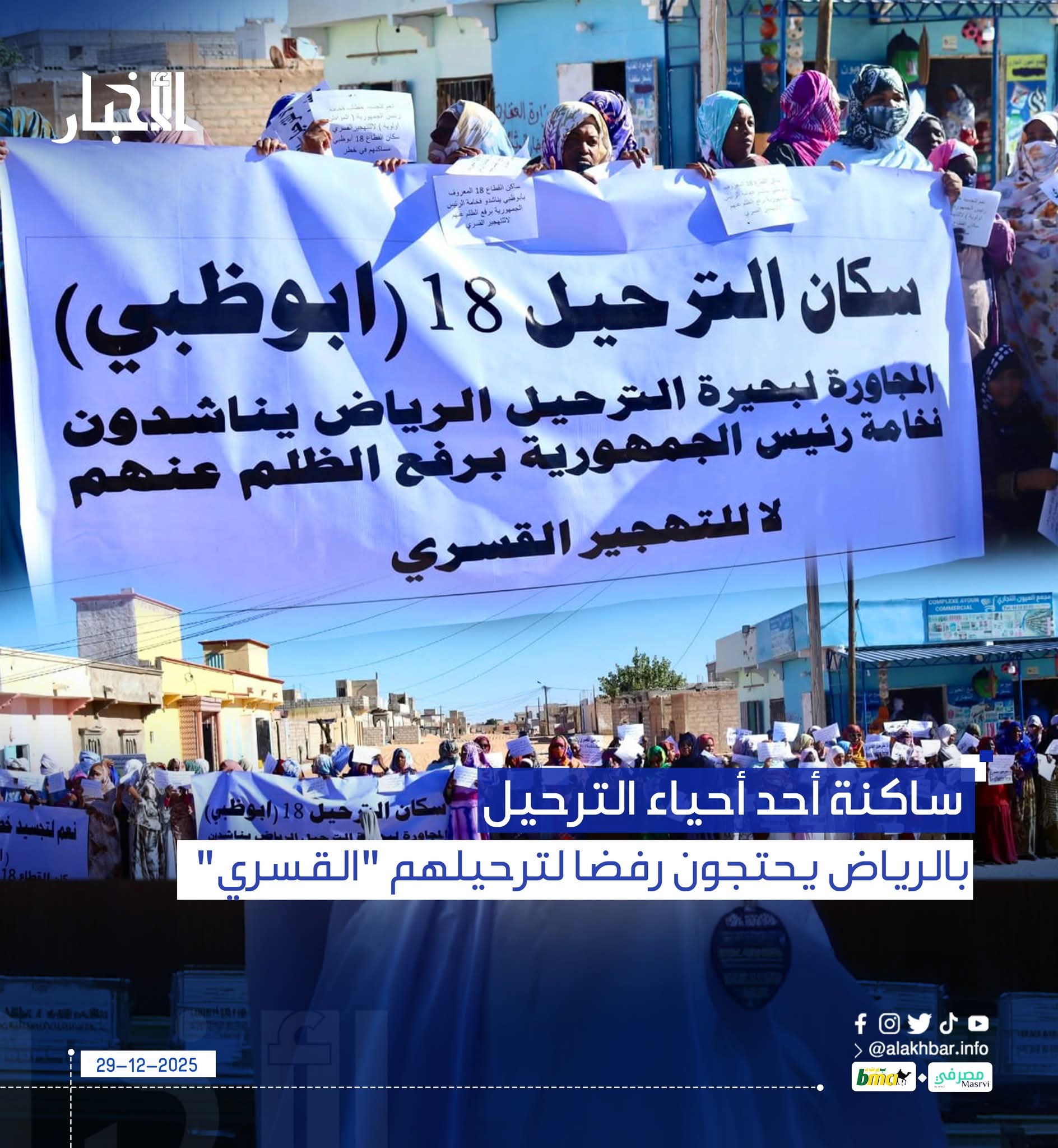 الأخبار (نواكشوط) – احتج اليوم الإثنين عدد من ساكنة ترحيل أبوظبي 18 التابع لمقاطعة الرياض بولاية نواكشوط الجنوبية، رفضا لقرار وزارة الأملاك ترحيلهم الذي وصفوه بـ”القسري” من الحي الذي سكنوه منذ سنوات عديدة، مطالبين الرئيس محمد ولد الغزواني بالتدخل لإنصافهم.