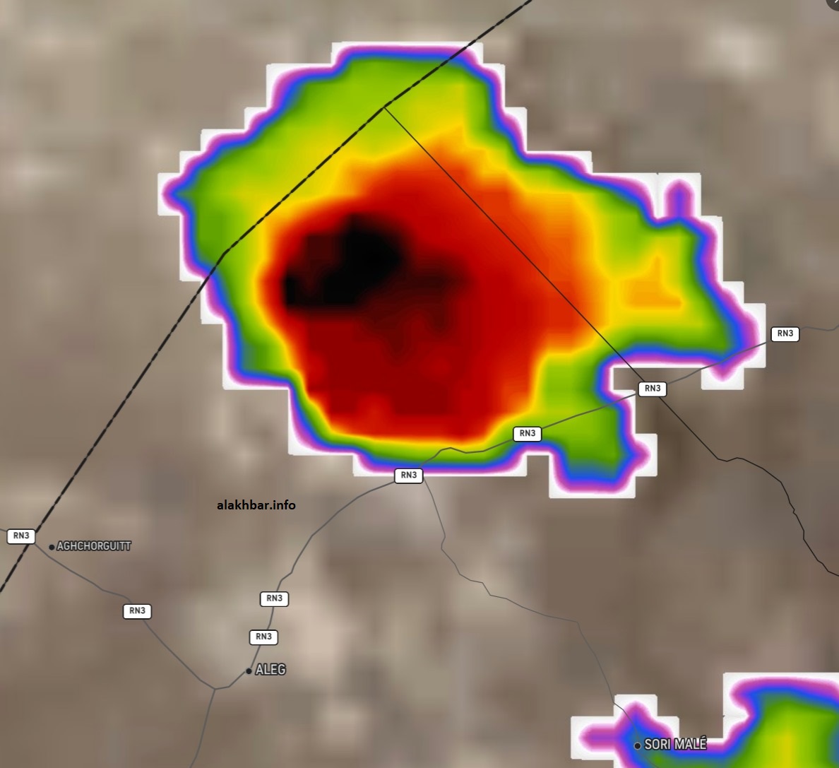 وفي حدود منتصف النهار، تكونت سحب أخرى غرب مدينة مكطع الحجار بولاية البراكنة، واتخذت من غرب طريق الأمل مسارا لها، وعند وصولها شمال غرب مدينة ألاك، ازدادت كثافة وانتشارا، وهي تتجه الآن نحو الشمال الغربي باتجاه ولاية الترارزة.