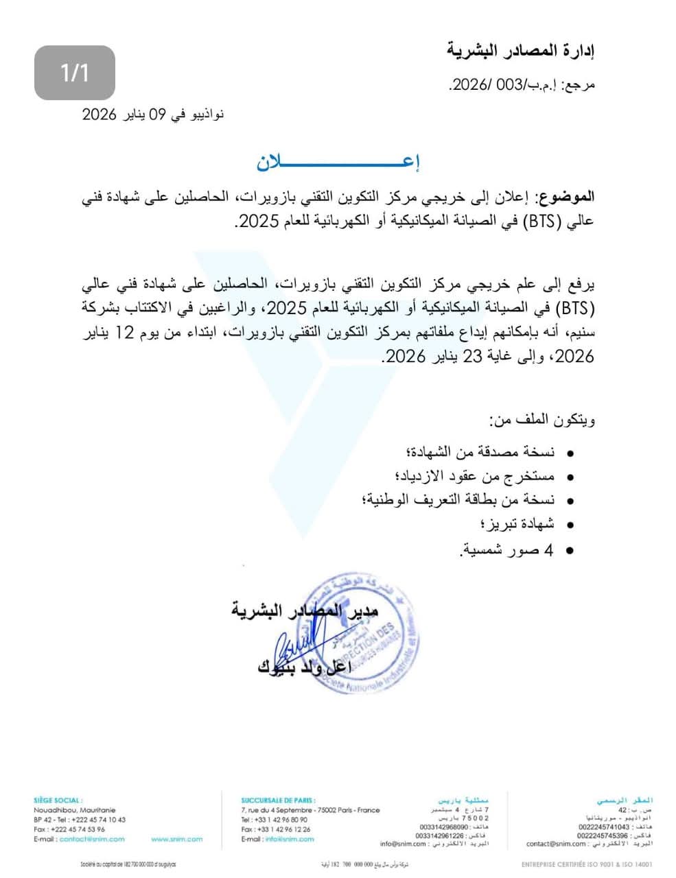 الأخبار (نواكشوط) – أعلنت إدارة المصادر البشرية في الشركة الوطنية للصناعة والمناجم “سنيم” عن فتح باب الترشح للاكتتاب أمام خريجي مركز التكوين التقني بالزويرات.