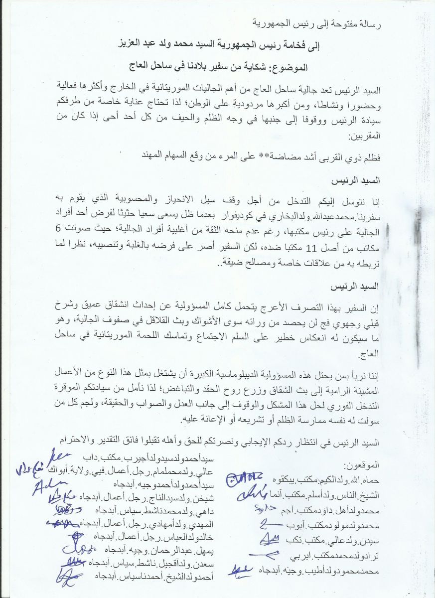 وحمل الموقعون السفير كامل المسؤولية عن إحداث انشقاق عميق وشرخ قبلي وجهوي فج لن يحصد من ورائه سوى الأشواك وبث القلاقل في صفوف الجالية، مشيرين إلى أن ذلك سيكون له انعكاس خطير على السلم الاجتماع وتماسك اللحمة الموريتانية في ساحل العاج.