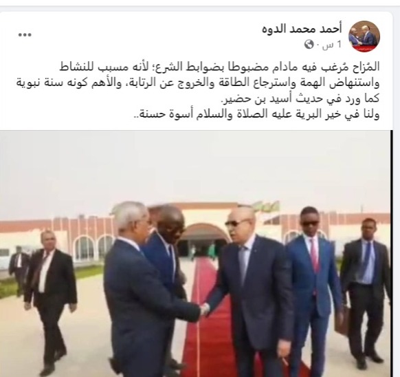 ونشر المستشار الإعلامي لوزير الخارجية أحمد ولد الدوه على صفحته في فيسبوك لقطة من الرئيس والوزير خلال حديثهما في المطار، وعلق بقوله: “المُزاح مُرغب فيه ما دام مضبوطا بضوابط الشرع؛ لأنه مسبب للنشاط واستنهاض الهمة واسترجاع الطاقة والخروج عن الرتابة، والأهم كونه سنة نبوية كما ورد في حديث أسيد بن حضير. ولنا في خير البرية عليه الصلاة والسلام أسوة حسنة”.