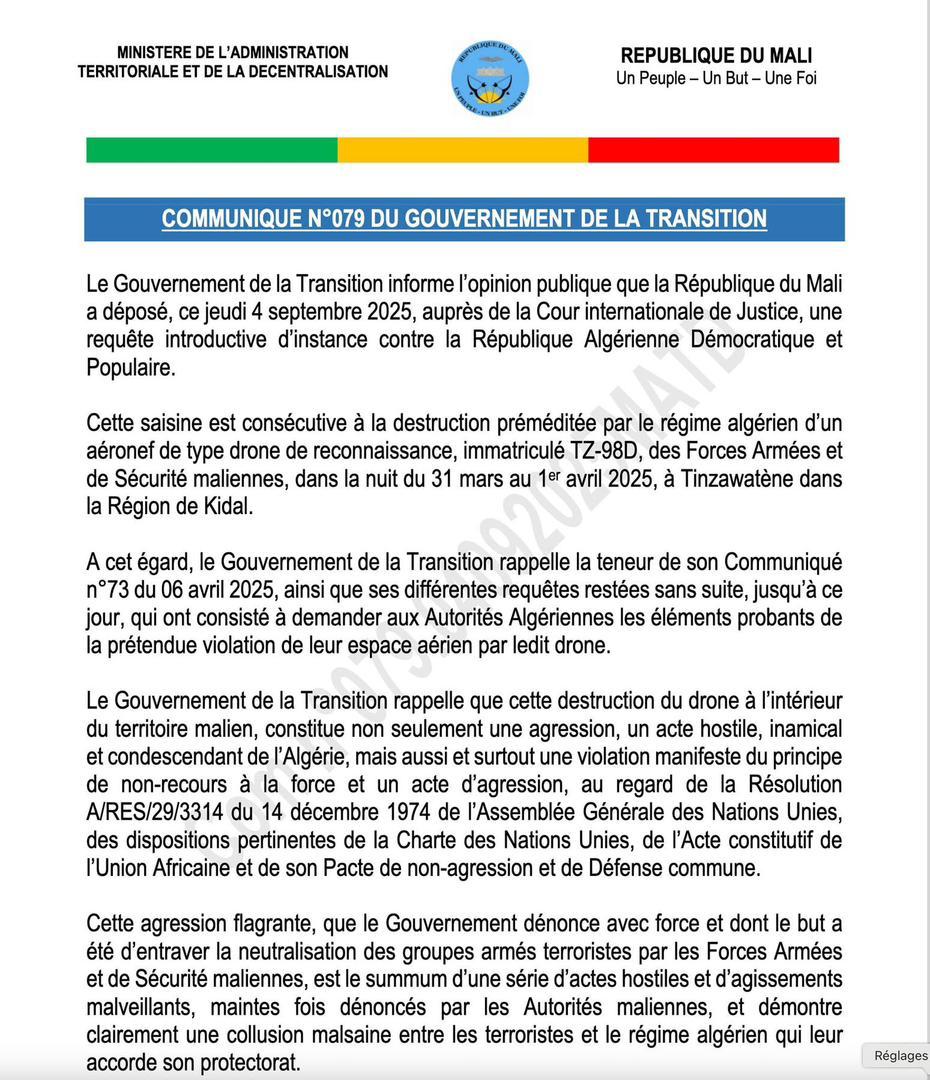 الأخبار (باماكو) – أعلنت الحكومة المالية اليوم الخميس أنها تقدمت بدعوى أمام محكمة العدل الدولية ضد الجزائر، وذلك على خلفية ما وصفته “التدمير المتعمد من قبل النظام الجزائري لطائرة استطلاع بدون طيار” تابعة لقوات الدفاع والأمن المالية قبل أشهر.