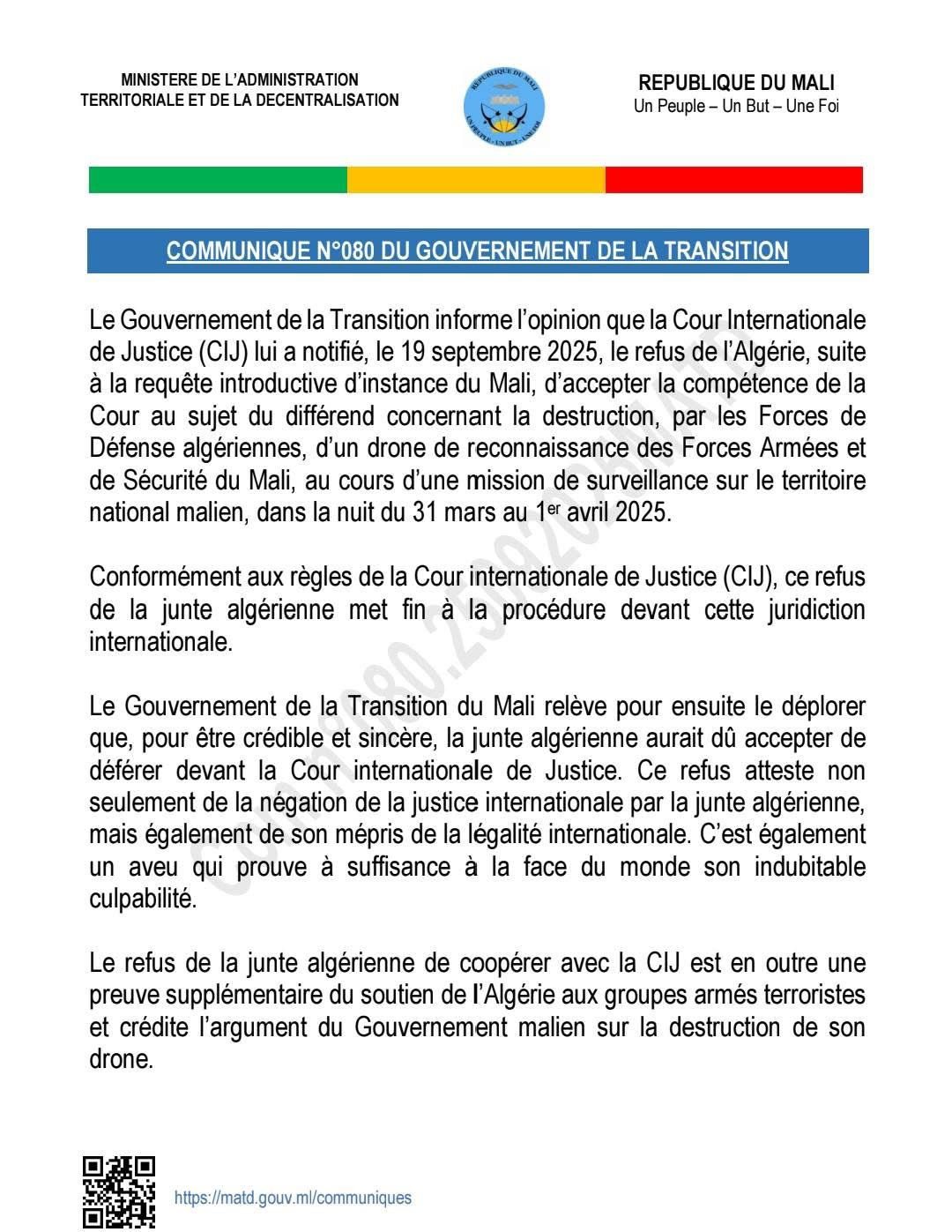 واعتبر البيان الموقع من طرف الناطق باسم الحكومة المالية الجنرال عبد الله مايغا، أن هذا الرفض “ليس فقط إنكارا من جانب المجلس العسكري الجزائري، للعدالة الدولية، بل إنه كذلك ازدراء بالشرعية الدولية”.