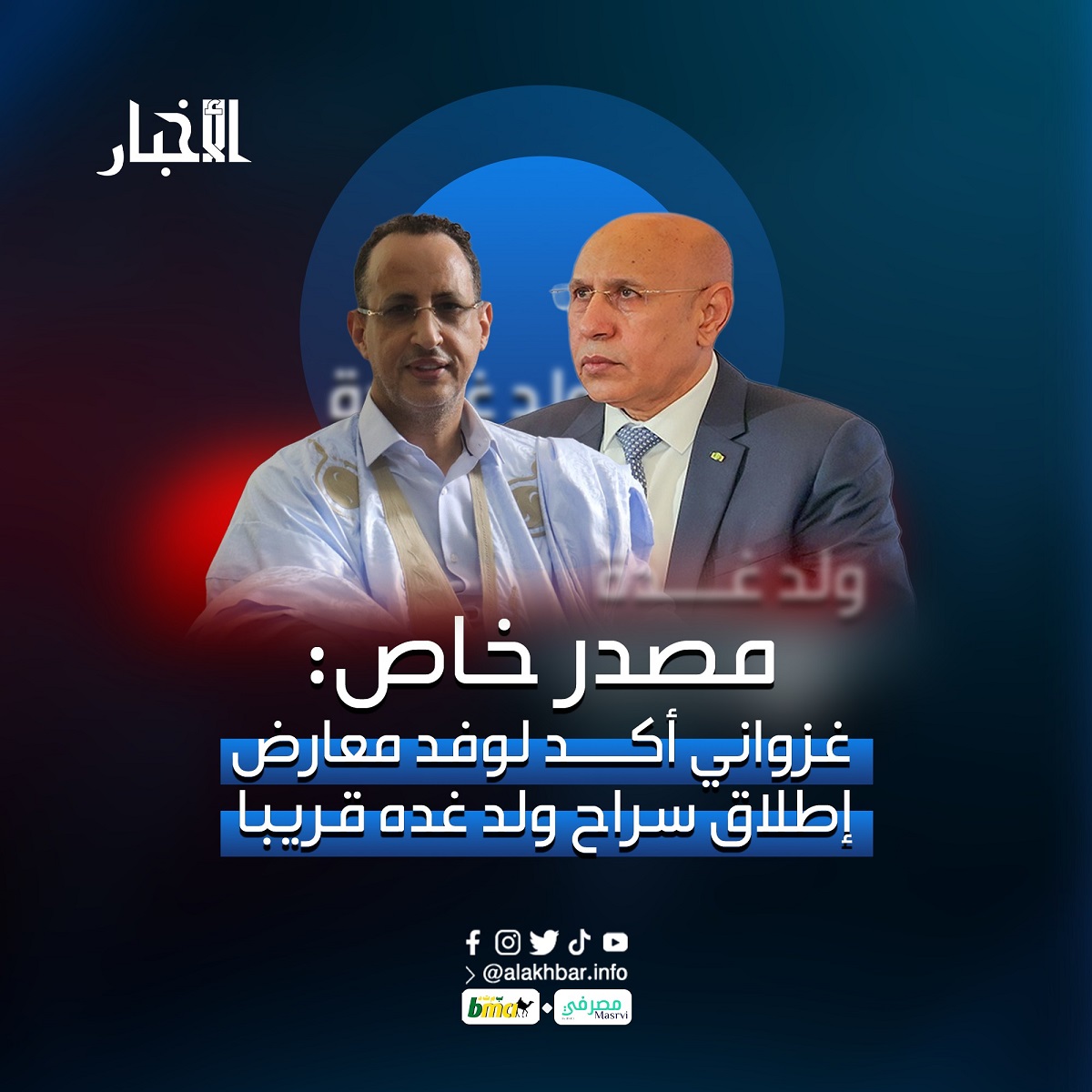 الأخبار (نواكشوط) – كشف مصدر خاص لوكالة الأخبار المستقلة أن الرئيس محمد ولد الغزواني أكد لوفد القوى المعارضة الذي التقاه اليوم إطلاق سراح رئيس منظمة الشفافية الشاملة السيناتور السابق محمد ولد غده قريبا.