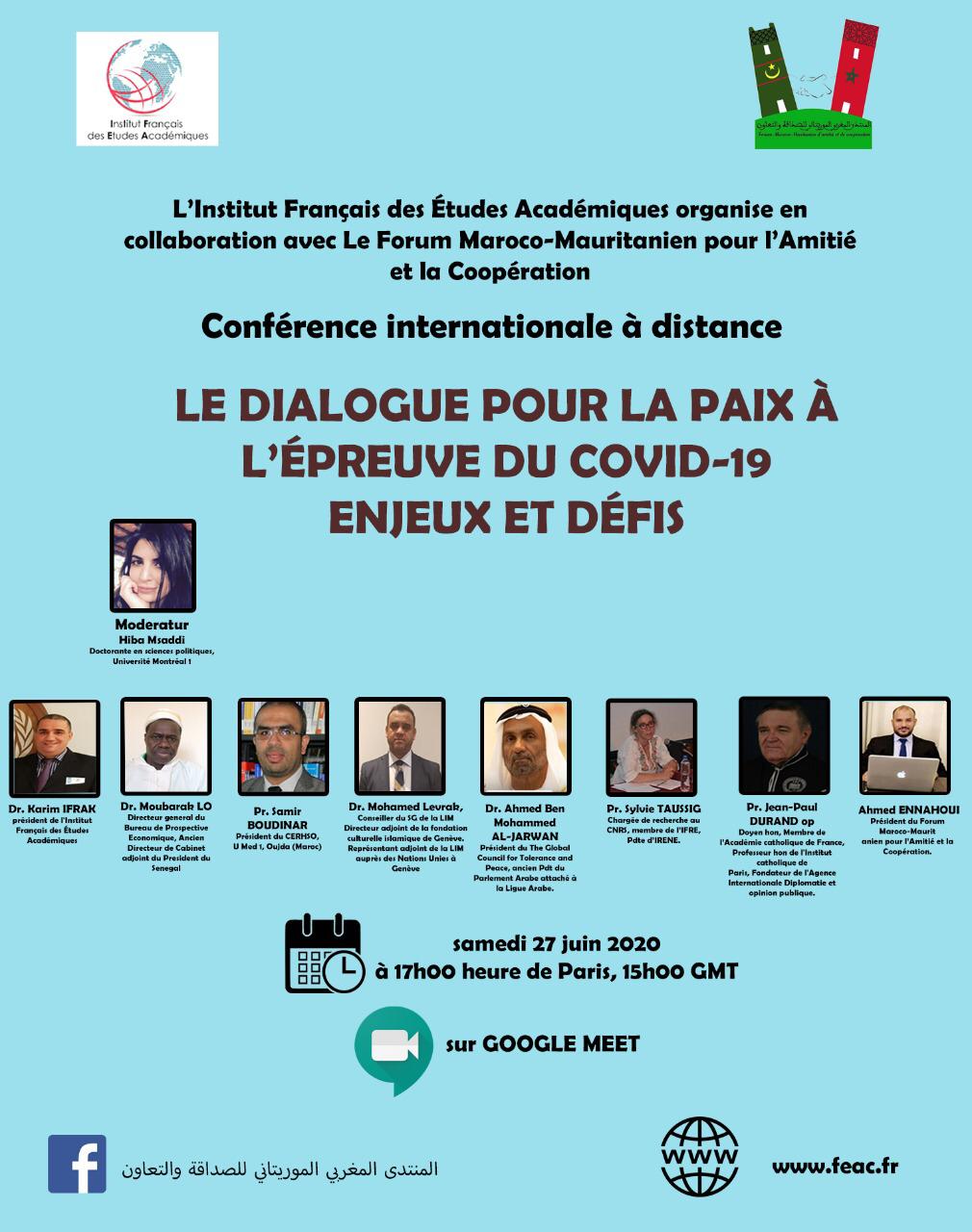 الأخبار (نواكشوط) ـ نظم المنتدى المغربي الموريتاني للصداقة والتعاون ندوة مشتركة مع المعهد الفرنسي للدراسات الأكاديمية بباريس، ناقشت موضوع: “الحوار من أجل السلام: الآفاق والتحديات في أفق جائحة كورونا”.