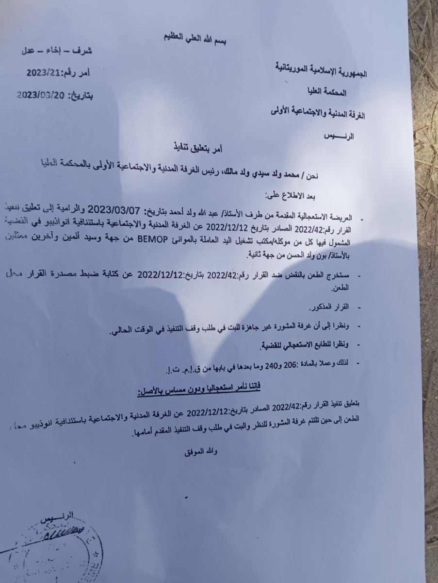 الأخبار (نواذيبو) – شكا المواطن الموريتاني المجتبى ولد محمد المختار من تعليق حكم تنفيذ صادر لصالحه عن الغرفة المدنية والاجتماعية باستئنافية نواذيبو منذ العام 2022.